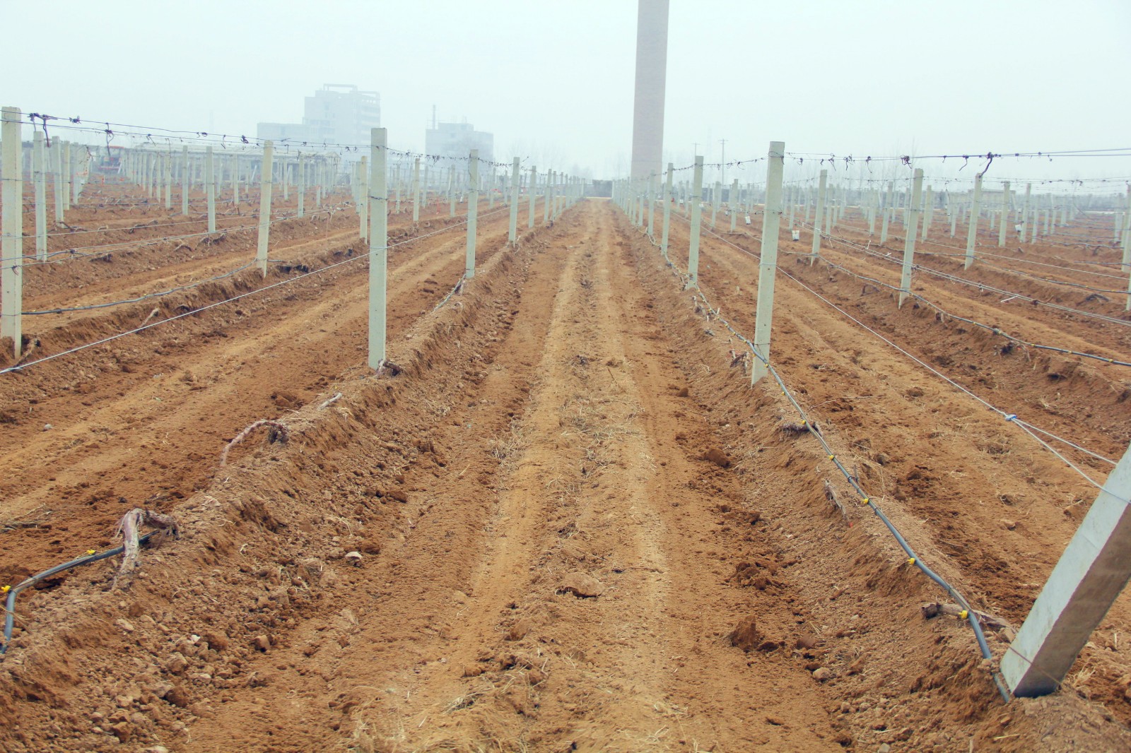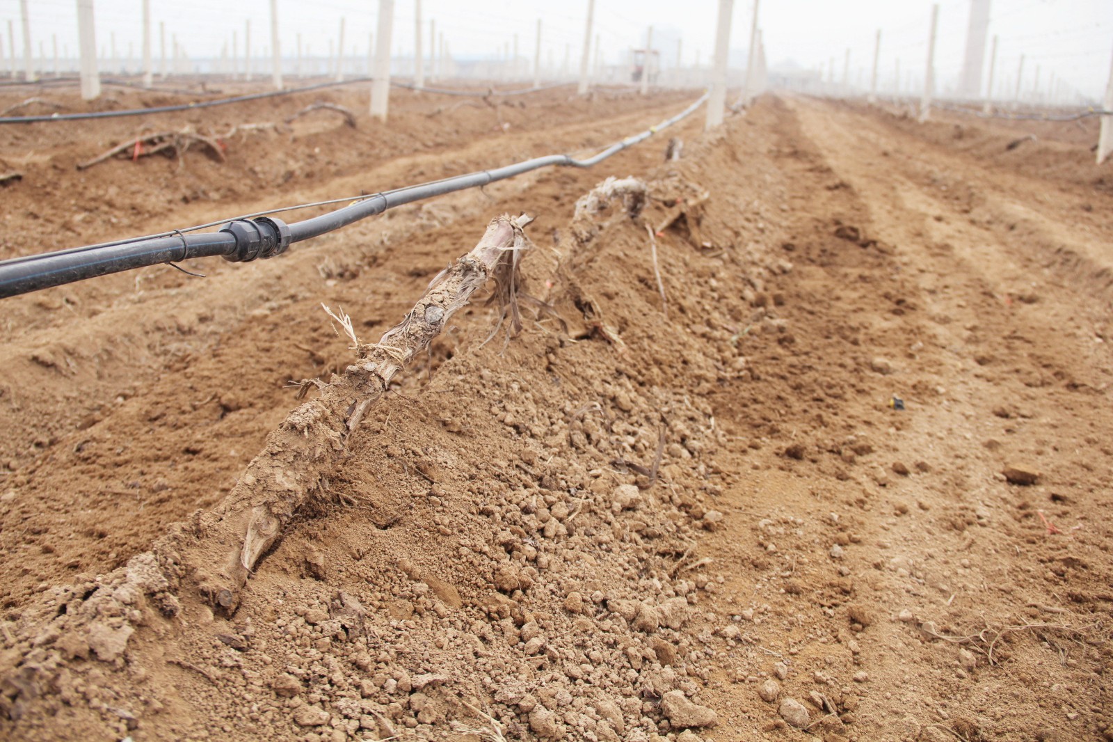 沒有埋土的葡萄樹,工人們修剪之后,用繩子將它固定在鐵架上,然后在葡萄樹根部進行滴灌,此時澆水主要是讓葡萄樹吸收足夠的營養,為今年的生長結果打下基礎。